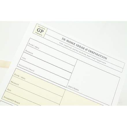 - “In-Home Ideas & Inspiration” notecard for you and your clients to fill out during the in-home walkthrough. Record ideas for decorating each room in the house to help clients make a decision when it comes time to place the orders!