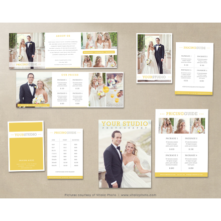 This set includes 16 Pricing Guide Brochures that include everything you need to inform your clients and can simply be edited to fit your style. All of the templates are provided in Photoshop format as layered PSD files, so it's easy to add your own photos and text. Each design element is on a separate layer for unlimited editing options.